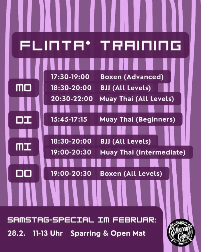 Willkommen bist du natürlich in allen Einheiten unseres Angebots. Wende dich gerne per E-Mailoder persönlich an Miriam, unsere Gleichstellungsbeauftragte, wenn du dich im Gym unwohl fühlst oder etwas ansprechen möchtest. Außerdem sind unsere FLINTA* Coaches Ansprechpartner*innen rund ums Training: Mehriban, Rosa, Alina, Vivi, Tordis (Muay Thai), Kema, Maryia (BJJ), Atiana (Boxen), Jojo und Kema (Kraftsport).